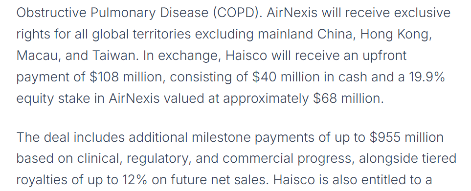 里程碑款项:AirNexis最高向公司支付9.55亿美元额外里程碑付款,具体根据临床开发、注册审批及商业化关键节点达成情况支付。