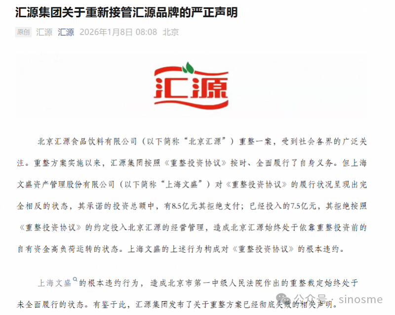 汇源发布《汇源集团关于重新接管汇源品牌的严正声明》。声明指出,北京汇源重整方案实施以来,汇源集团按照《重整投资协议》按时、全面履行了自身义务。但上海文盛资产管理股份有限公司(以下简称“上海文盛”)对《重整投资协议》的履行状况呈现出完全相反的状态,其承诺的投资总额中,有8.5亿元其拒绝支付;已经投入的7.5亿元,其拒绝按照《重整投资协议》的约定投入北京汇源的经营管理,造成北京汇源始终处于依靠重整投资前的自有资金高负荷运转的状态。