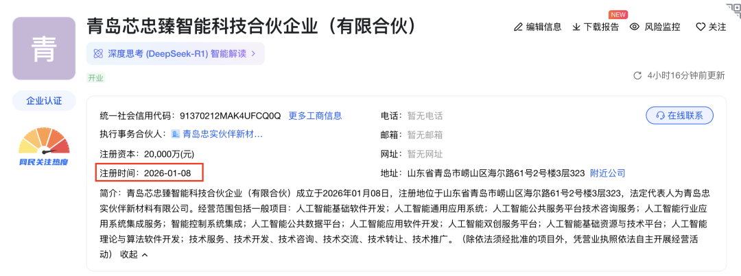 公开资料显示,青岛芯忠臻成立于2026年1月8日,注册资本2亿元,注册地位于青岛市崂山区,经营范围包括人工智能基础软件开发、人工智能通用应用系统、人工智能公共服务平台技术咨询服务、人工智能行业应用系统集成服务、智能控制系统集成、人工智能公共数据平台等。