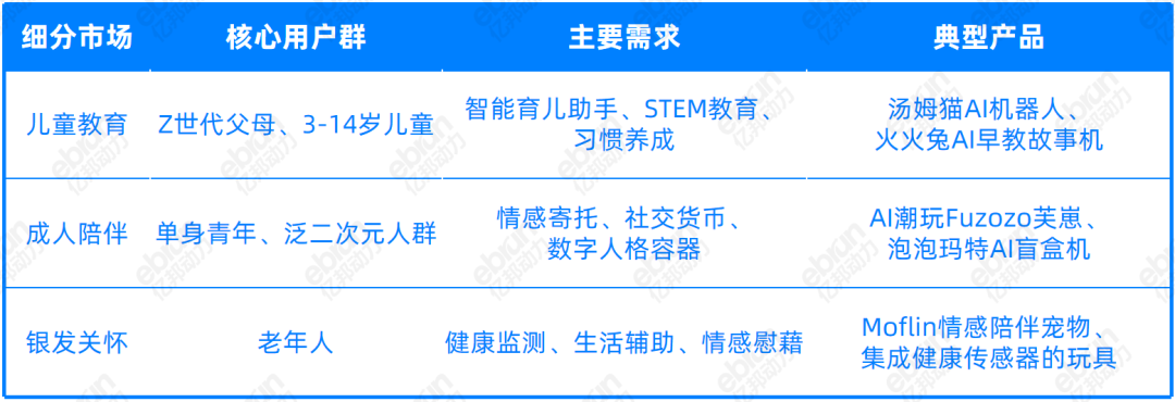 从消费人群看,AI玩具正从传统儿童市场扩展到全年龄层,形成了儿童教育、成人陪伴和银发关怀三大核心应用场景。