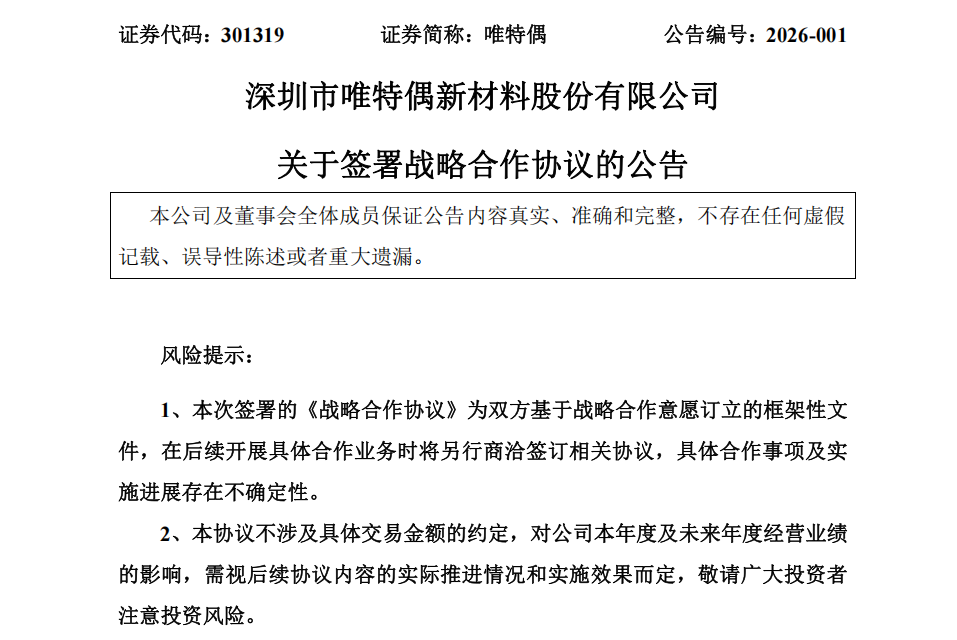 中长期目标为,双方计划成立合资公司(由唯特偶或其指定的下属公司共同组建),共同打造“新材料—机器人—行业应用”的产业生态闭环,借助七腾机器人在行业的资源和经验,以及唯特偶的新材料技术,共同开发化工、石油、电力、白酒、面粉、应急救援等行业应用场景,推动唯特偶的新材料在相关行业的推广应用,解决相关行业的消防和防爆痛点问题,推动相关行业的安全升级,并共同推动制定行业相关应用标准。推动具备灭火功能的机器人研发,实现巡检+高效灭火的新型机器人。在其他领域,双方推动资本层面合作(如设立合资公司)、共建行业联合实验室、共同制定“新材料+机器人”行业应用标准等合作可能性。