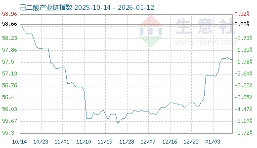 1月13日生意社己二酸产业链指数为57.24,较昨日下降了0.48点,较周期内最高点118.77点(2021-10-19)下降了51.81%,较2016年01月27日最低点50.35点上涨了13.68%。(注:周期指至今)