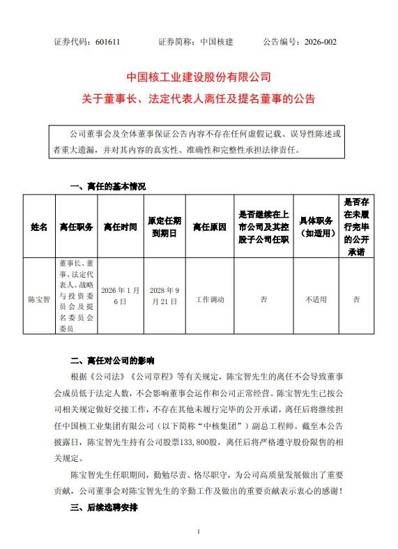 1月6日,中国核建(601611)发布关于董事长、法定代表人离任及提名董事的公告。因工作调动,陈宝智申请辞去公司董事长、董事、法定代表人、战略与投资委员会及提名委员会委员职务。其原定任期到期日为2028年9月21日。