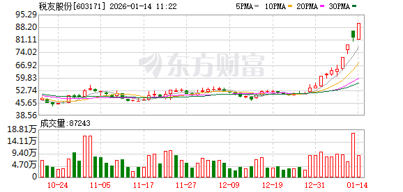 税友股份再度涨停,4个交易日内录得3个涨停,累计涨幅为39.63%,累计换手率为9.83%。截至9:52,该股今日成交量710.89万股,成交金额6.19亿元,换手率1.75%。最新A股总市值达366.52亿元,A股流通市值366.11亿元。