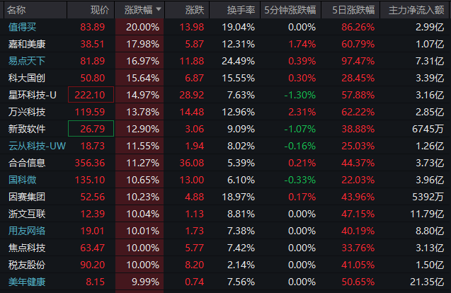 值得买20%涨停,易点天下、科大国创、海天瑞声、中文在线涨超10%,浙文互联、人民网、新华网、焦点科技、欢瑞世纪、新华传媒、三维通信、卓易信息、天娱数科、岩山科技等个股批量涨停。