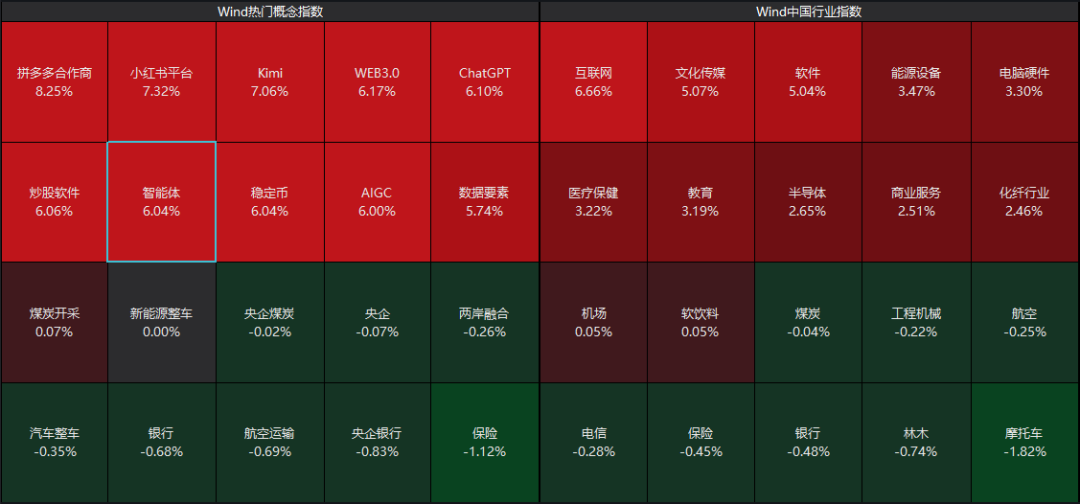 AI应用主线再度爆发,拼多多合作商、小红书平台、Kimi、智能体、AIGC、互联网、文化传媒等概念持续大涨。