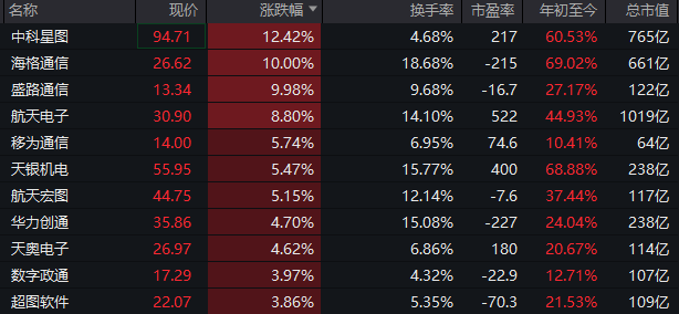 商业航天概念在昨日大幅调整之后有所回暖,中国卫星翻红,盘中一度跌超7%,中科星图涨超12%,海格通信10%涨停,航天电子、航天宏图等涨幅居前。