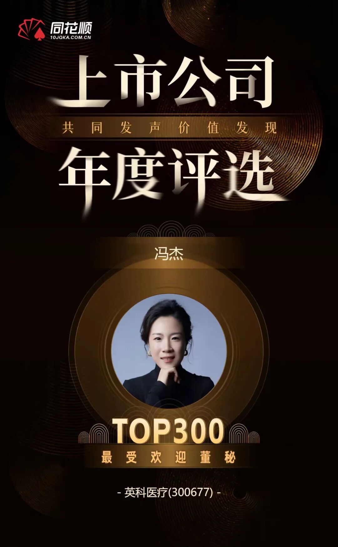 近日,在同花顺财经发起的上市公司年度评选中,英科医疗董事会秘书冯杰女士,凭借在信息披露、投资者关系管理等方面的卓越表现,成功上榜“最受欢迎董秘TOP300”,充分体现了资本市场对其专业能力与履职成效的高度认可。