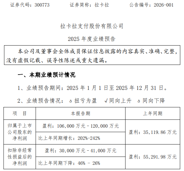 日前,拉卡拉支付股份有限公司发布2025年度业绩预告。