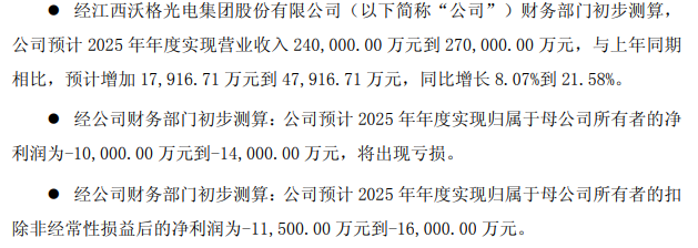 沃格光电(603773)同样面临持续亏损困境,公司预计 2025 年归属于母公司所有者的净利润为 - 1 亿元至 - 1.4 亿元,继 2021 年至 2024 年连亏四年后,将迎来五连亏。不过,公司营收实现稳健增长,预计 2025 年营业收入为 24 亿元至 27 亿元,同比增幅达 8.07% 至 21.58%。