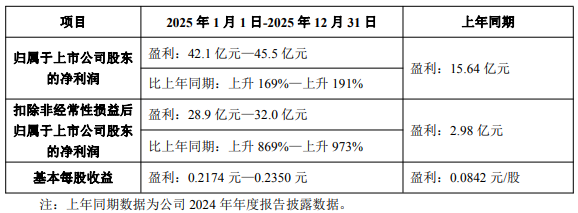 1月13日,TCL 科技发布公告称,预计 2025 年净利润为 42.1 亿元至 45.5 亿元,同比增幅高达 169% 至 191%,扣非后净利润同比增长 869% 至 973%。