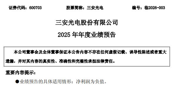 作为传统 LED 芯片龙头,三安光电(600703)公告显示,2025 年度预计归属于上市公司股东的净利润为 - 2 亿元至 - 4 亿元,扣非后净亏损达 7.5 亿元至 8.5 亿元,这是公司 2008 年借壳上市以来首次年度亏损。值得注意的是,公司 2025 年前三季度仍盈利 8860 万元,年末业绩骤然转亏引发市场关注。