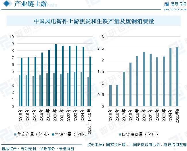 就风电铸件上游原材料的整体现状来看,目前我国焦炭与生铁的产量总体上保持平稳增长态势。数据显示,中国焦炭产量从2015年的4.48亿吨逐步提升至2024年的4.89亿吨,年均复合增长率为0.98%;2025年1-10月,全国焦炭产量达到4.19亿吨,较去年同期增长3.3%。与此同时,2024年中国生铁产量为8.52亿吨,同比小幅下降2.18%;2025年1-10月,生铁产量为7.11亿吨,同比下降1.8%。尽管自2020年以来生铁产量出现一定程度的回落,但整体供给仍处于相对稳定状态,对风电铸件行业的影响较为有限。另一方面,从废钢资源的角度观察,随着我国机械工业的持续发展,废钢消费量呈现快速上升趋势。作为废钢的重要下游应用领域之一,风电铸件行业对废钢的需求保持稳定增长。具体来看,中国废钢消费量从2015年的0.93亿吨大幅攀升至2024年的2.52亿吨,年均复合增长率高达11.71%;预计到2025年,中国废钢消费量将进一步增长至2.53亿吨,反映出其在原材料供应链中日益重要的地位。