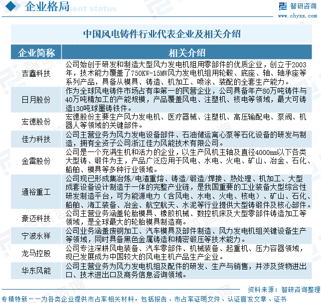 中国风电铸件行业已形成较高准入壁垒,具有投资大、周期长、技术难的特点。国内头部企业通过技术积累,在轮毂、底座等关键部件领域已达到国际水平,成功进入全球主流供应链。随着风电大型化发展,具备技术实力和规模优势的企业将持续巩固市场地位,推动行业集中度提升。当前,中国风电铸件行业代表企业包括吉鑫科技、日月股份、宏德股份、佳力科技、金雷股份、通裕重工、豪迈科技、宁波永祥、龙马控股、华东风能等。