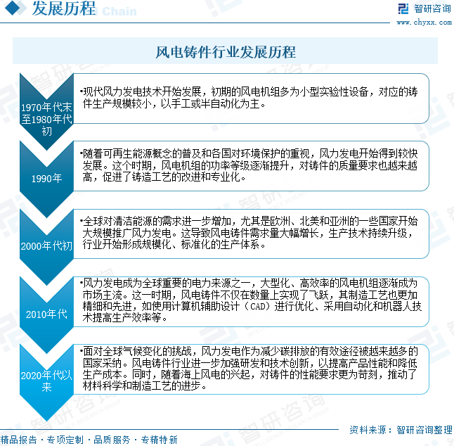1970年代末至1980年代初,现代风力发电技术开始发展,初期的风电机组多为小型实验性设备,对应的铸件生产规模较小,以手工或半自动化为主。1990年,随着可再生能源概念的普及和各国对环境保护的重视,风力发电开始得到较快发展。这个时期,风电机组的功率等级逐渐提升,对铸件的质量要求也越来越高,促进了铸造工艺的改进和专业化。2000年代初,全球对清洁能源的需求进一步增加,尤其是欧洲、北美和亚洲的一些国家开始大规模推广风力发电。这导致风电铸件需求量大幅增长,生产技术持续升级,行业开始形成规模化、标准化的生产体系。2010年代,风力发电成为全球重要的电力来源之一,大型化、高效率的风电机组逐渐成为市场主流。这一时期,风电铸件不仅在数量上实现了飞跃,其制造工艺也更加精细和先进,如使用计算机辅助设计(CAD)进行优化、采用自动化和机器人技术提高生产效率等。2020年代以来,面对全球气候变化的挑战,风力发电作为减少碳排放的有效途径被越来越多的国家采纳。风电铸件行业进一步加强研发和技术创新,以提高产品性能和降低生产成本。同时,随着海上风电的兴起,对铸件的性能要求更为苛刻,推动了材料科学和制造工艺的进步。
