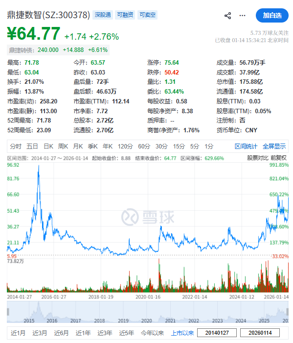 鼎捷数智(300378.SZ)于2014年1月27日在深交所上市,截至周三(2026年1月14日)收市,其总市值约175.88亿元人民币。