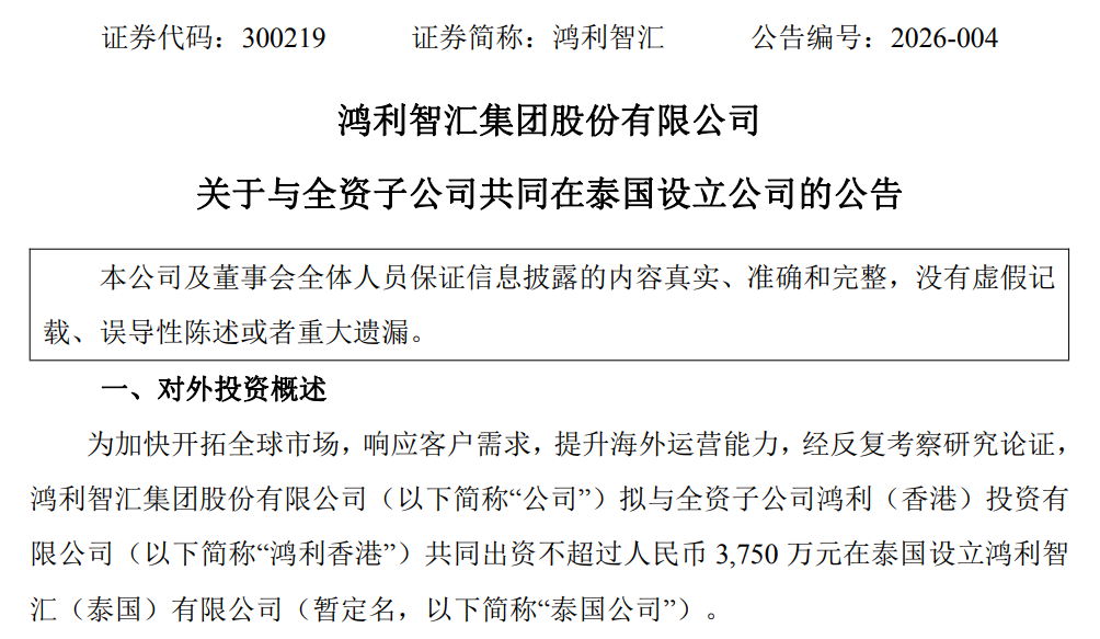 1月14日,鸿利智汇发布公告称,为加快开拓全球市场、提升海外运营能力并满足国际客户的配套需求,公司拟与全资子公司鸿利(香港)投资有限公司(以下简称“鸿利香港”)共同出资,在泰国设立“鸿利智汇(泰国)有限公司”(暂定名)。