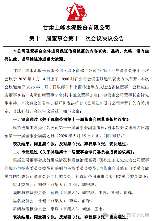 日前,上峰水泥发布《第十一届董事会第十一次会议决议公告》显示,公司第十一届董事会第十一次会议审议通过拟选举王志先生为公司第十一届董事会副董事长,自本次会议通过之日起至第十一届董事会届满之日(2028 年 5 月 15 日)止。