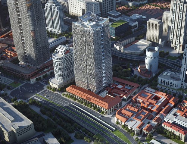 在项目规划布局上,两大地块功能定位清晰、特色鲜明。198号地块地上包括1栋办公楼,地上层数36层,高度约185米,裙房骑楼地上层数3~4层,其中金陵东路保留裙房骑楼(地上3层);200号地块两栋单体地上3~4层为主的多层商业,高16.70米~16.96米。地下共4层,地块地下室结构外边线与地铁14号线豫园站车站附属结构外边线最小净距约1米,与区间隧道最小净距约18米。