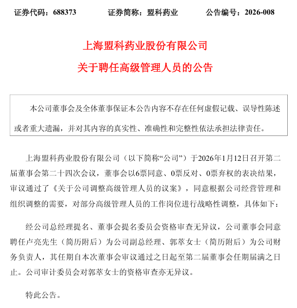1月14日,盟科药业公告关键高级管理人员调整:聘任原监事会主席卢亮为副总经理。