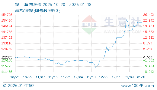 据生意社监测,镍01月18日最新价格149150.00元/吨,最近15天上涨8.29%,20天上涨12.72%,30天上涨23.86%,60天上涨26.36%。