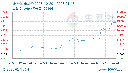 据生意社监测,锌01月18日最新价格24790.00元/吨,最近60天上涨10.67%。