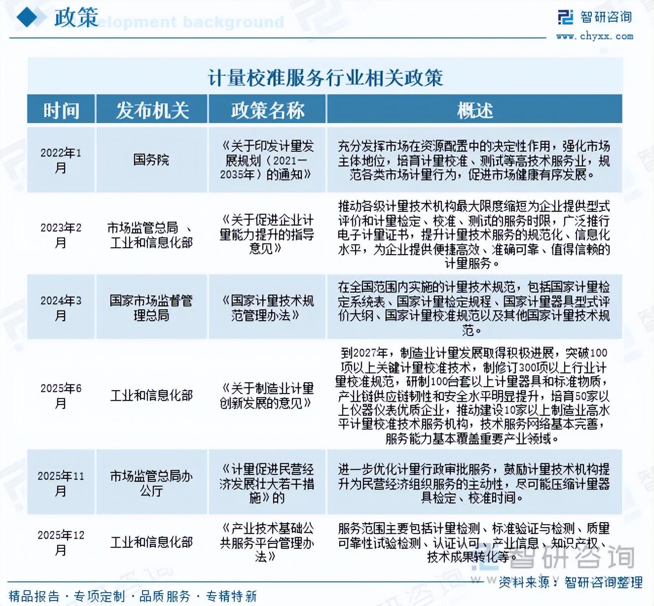 计量校准服务作为现代工业、科研和社会生活中不可或缺的一环,直接关联到产品质量、生产效率、安全性能乃至国家的整体竞争力。近年来,我国政府出台了一系列政策,积极推动计量校准服务行业发展。如2022年1月发布的《关于印发计量发展规划(2021—2035年)的通知》中,提出充分发挥市场在资源配置中的决定性作用,强化市场主体地位,培育计量校准、测试等高技术服务业,规范各类市场计量行为,促进市场健康有序发展。2025年6月发布的《关于制造业计量创新发展的意见》中,提出到2027年,制造业计量发展取得积极进展,突破100项以上关键计量校准技术,制修订300项以上行业计量校准规范,研制100台套以上计量器具和标准物质,产业链供应链韧性和安全水平明显提升,培育50家以上仪器仪表优质企业,推动建设10家以上制造业高水平计量校准技术服务机构,技术服务网络基本完善,服务能力基本覆盖重要产业领域。