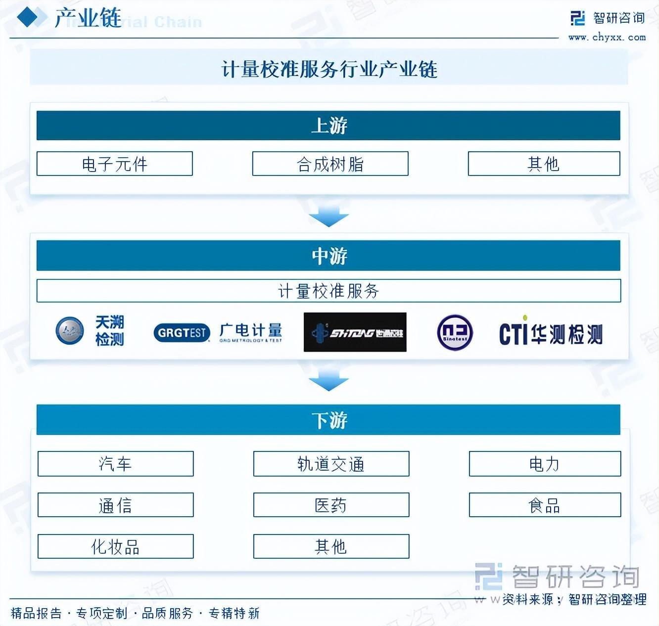 从产业链来看,计量校准服务行业上游主要包括电子元件、合成树脂和其他类物品,整体原料供应较为充足,但仍在少部分高技术要求零部件以进口为主,一定程度限制了产业的快速扩张。中游是指计量校准服务。下游是指计量校准服务的应用领域,主要包括汽车、轨道交通、电力、通信、医药、食品、化妆品等各行各业。
