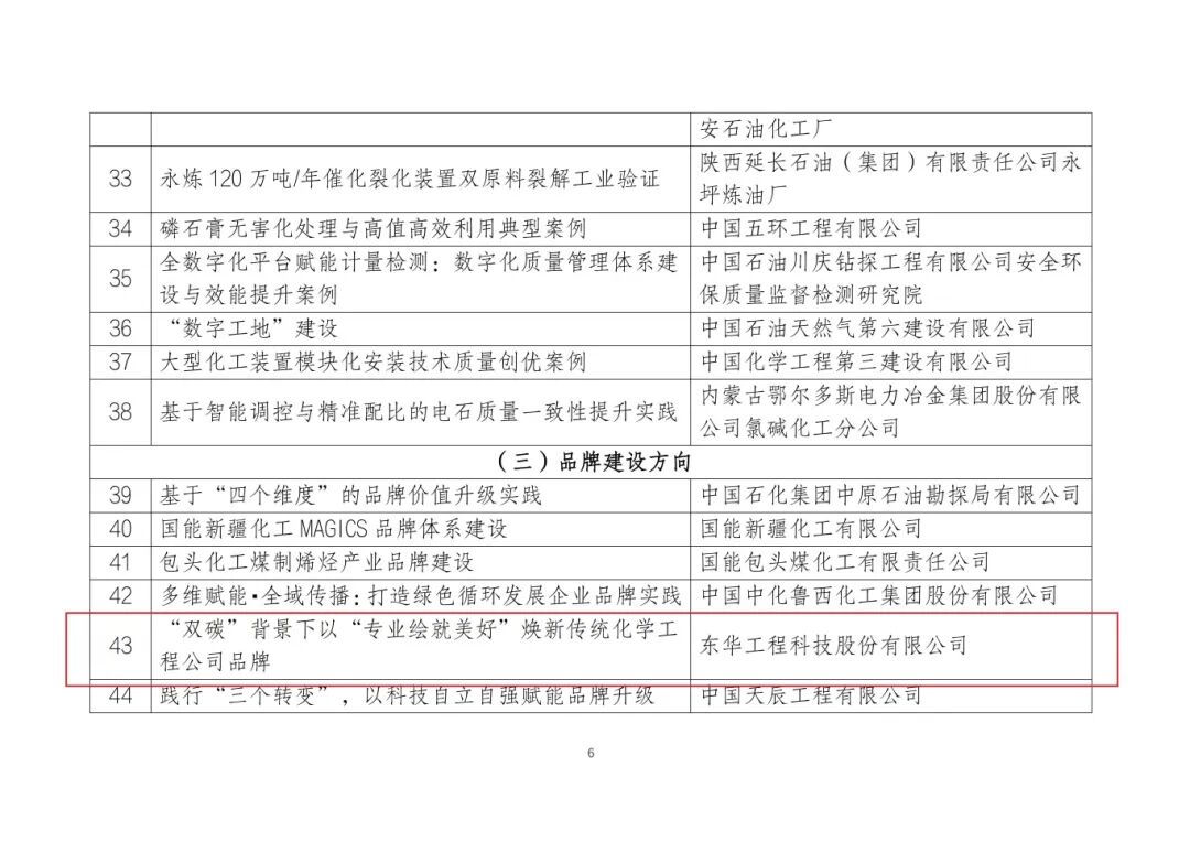 近日,中国石油和化学工业联合会公布了2025年度石油和化工行业质量提升与品牌建设典型案例名单,中国化学工程东华公司申报的《“双碳”背景下以“专业绘就美好”焕新传统化学工程公司品牌》案例脱颖而出,成功入选品牌建设方向典型案例。
