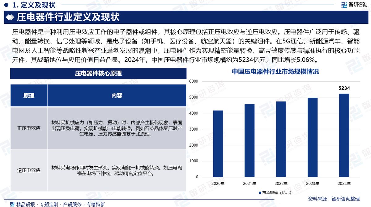 市场规模:在5G通信、新能源汽车、智能电网及人工智能等战略性新兴产业蓬勃发展的浪潮中,压电器件作为实现精密能量转换、高灵敏度传感与精准执行的核心功能元件,其战略地位与应用价值日益凸显。2024年,中国压电器件行业市场规模约为5234亿元,同比增长5.06%。