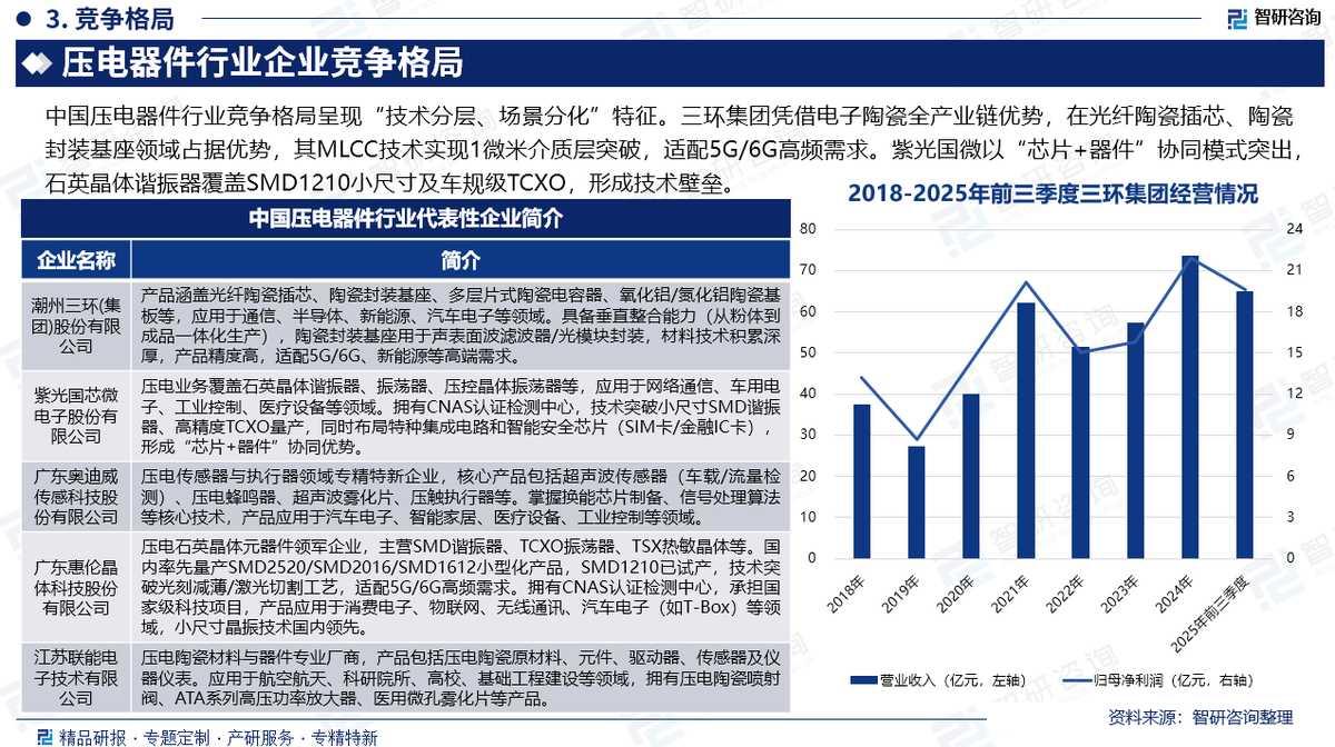 竞争情况:中国压电器件行业竞争格局呈现“技术分层、场景分化”特征。三环集团凭借电子陶瓷全产业链优势,在光纤陶瓷插芯、陶瓷封装基座领域占据优势,其MLCC技术实现1微米介质层突破,适配5G/6G高频需求。紫光国微以“芯片+器件”协同模式突出,石英晶体谐振器覆盖SMD1210小尺寸及车规级TCXO,形成技术壁垒。奥迪威聚焦压电传感器与执行器,车载超声波传感器国内市占率领先。广东惠伦晶体科技则主攻小型化谐振器,适配物联网高频需求。