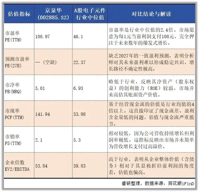 下表将京泉华的核心估值指标与A股行业中位值进行对比,其溢价与风险一目了然: