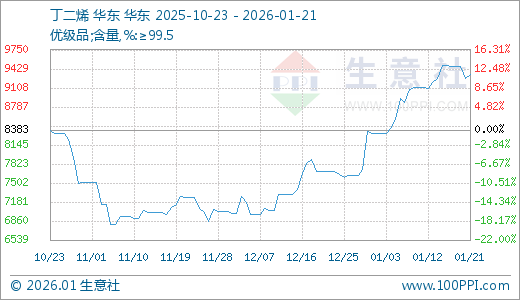 据生意社监测,丁二烯01月21日最新价格9340.00元/吨,最近20天上涨12.08%,30天上涨21.30%,60天上涨28.83%。