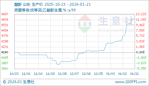 据生意社监测,醋酐01月21日最新价格4622.50元/吨,最近10天上涨7.31%,15天上涨7.69%,30天上涨11.05%,60天上涨14.84%。