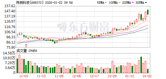 伟测科技股价再创历史新高,该股近期呈不断突破新高之势,近一个月累计有12个交易日股价刷新历史纪录。截至09:32,该股目前上涨1.14%,股价报147.46元,成交87.04万股,成交金额1.29亿元,换手率0.58%,该股最新A股总市值达219.79亿元,该股A股流通市值219.79亿元。