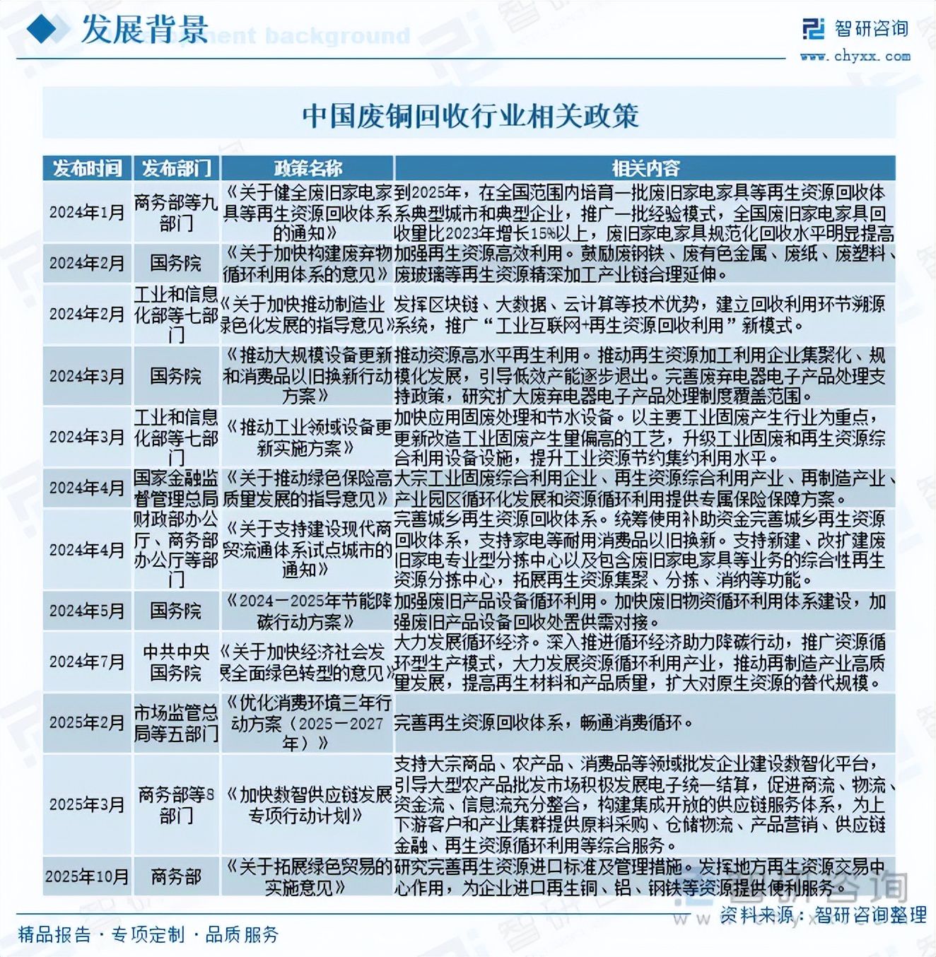 我国高度重视包括废铜回收在内的再生资源回收产业发展,相继发布《关于健全废旧家电家具等再生资源回收体系的通知》《关于加快构建废弃物循环利用体系的意见》《关于加快推动制造业绿色化发展的指导意见》《推动大规模设备更新和消费品以旧换新行动方案》《推动工业领域设备更新实施方案》《关于推动绿色保险高质量发展的指导意见》《关于支持建设现代商贸流通体系试点城市的通知》《2024—2025年节能降碳行动方案》《关于加快经济社会发展全面绿色转型的意见》《优化消费环境三年行动方案(2025—2027年)》《加快数智供应链发展专项行动计划》《关于拓展绿色贸易的实施意见》等一系列政策支持、鼓励行业发展,为我国废铜回收行业发展提供了良好的政策环境。