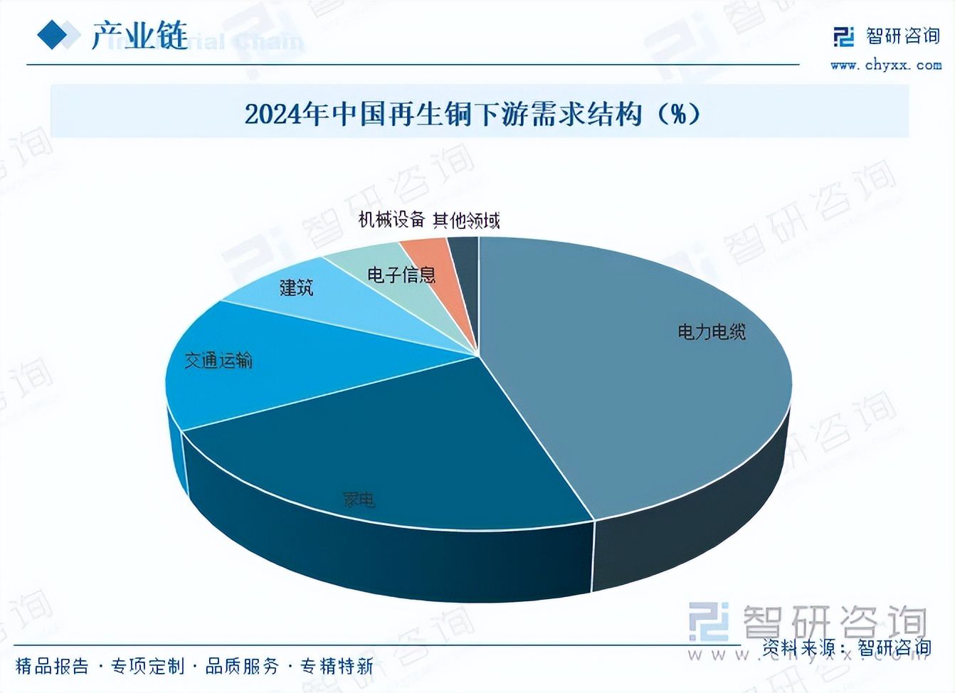 我国废铜回收下游为再生铅应用,目前,我国再生铜主要用于生产电力电缆、家电、交通运输、建筑、电子信息、机械设备等,成为替代原生铜的重要资源,从下游需求结构来看,电力电缆为我国再生铜最核心需求市场,2024年占比超40%,其次为家电和交通运输领域,分别占22%和15%。