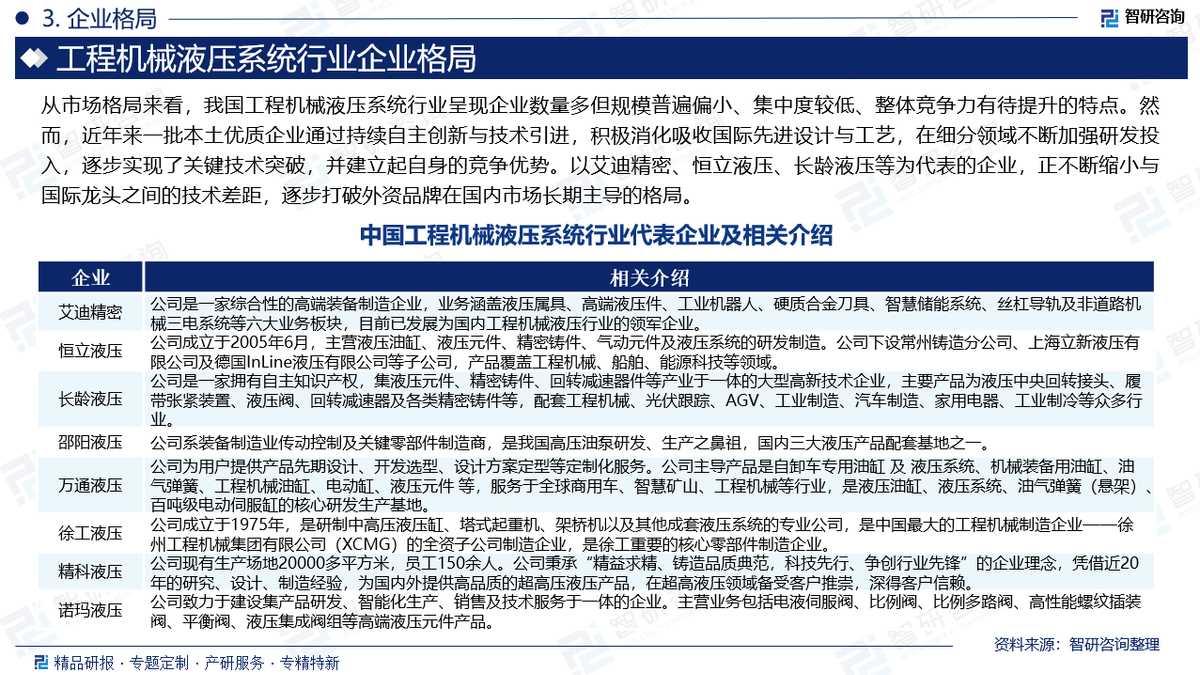 企业格局:从市场格局来看,我国工程机械液压系统行业呈现企业数量多但规模普遍偏小、集中度较低、整体竞争力有待提升的特点。然而,近年来一批本土优质企业通过持续自主创新与技术引进,积极消化吸收国际先进设计与工艺,在细分领域不断加强研发投入,逐步实现了关键技术突破,并建立起自身的竞争优势。以艾迪精密、恒立液压、长龄液压等为代表的企业,正不断缩小与国际龙头之间的技术差距,逐步打破外资品牌在国内市场长期主导的格局。