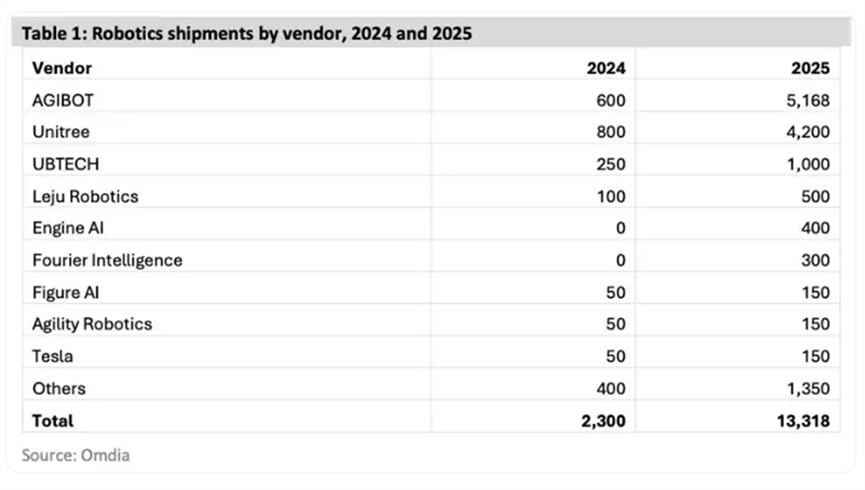 全球市场研究机构Omdia发布的《通用具身机器人市场雷达》报告显示,2025年全球人形机器人总出货量预计达13318台,其中中国厂商占据了超过80%的市场份额,在绝对数量上远超特斯拉和Figure AI等美国企业。智元以超过5168台的年度出货量位居全球第一,宇树以4200台紧随其后,优必选则以1000台位居第三。相比之下,备受关注的Figure AI、特斯拉及Agility Robotics在2025年的出货量均仅为150台,三家合计市场份额仅约3%。