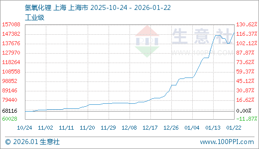 据生意社监测,氢氧化锂01月22日最新价格149000.00元/吨,最近5天上涨4.20%,10天上涨12.03%,15天上涨29.75%,20天上涨44.89%,30天上涨77.73%,60天上涨98.58%。