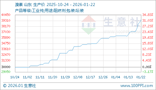 据生意社监测,溴素01月22日最新价格39500.00元/吨,最近5天上涨6.47%,10天上涨9.12%,30天上涨11.58%,60天上涨25.40%。