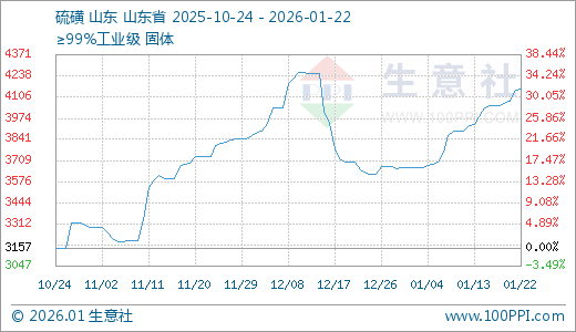 据生意社监测,硫磺01月22日最新价格4160.00元/吨,最近10天上涨5.94%,15天上涨10.64%,20天上涨13.63%,30天上涨14.67%。