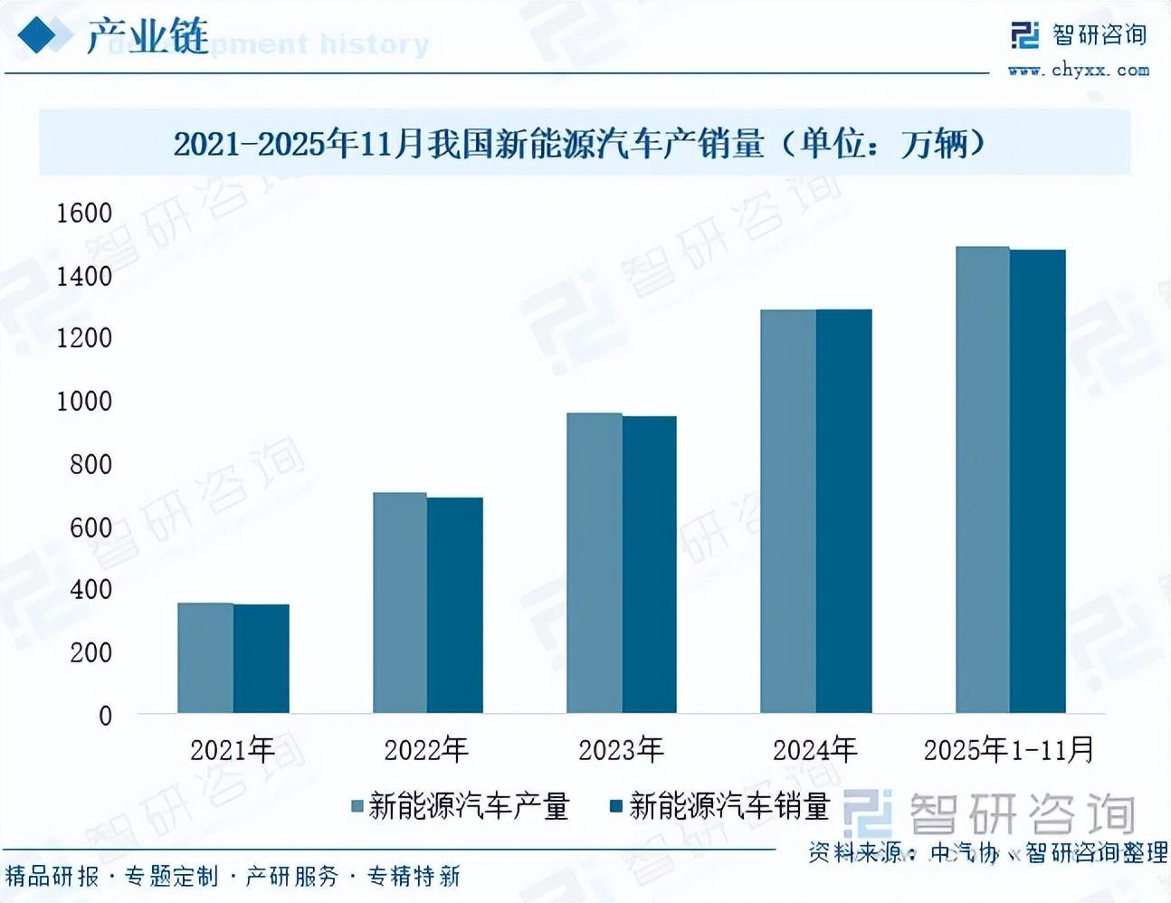 中国新能源绝缘材料下游核心市场呈现“需求爆发、技术升级、国产化加速”的特征。目前,新能源汽车领域是新能源绝缘材料最核心的增量市场,800V高压平台已成为中高端车型标配并向1000V架构迈进,直接推动单车绝缘件价值量从320元跃升至1500元。核心需求集中在电机绕组、电池包、高压连接器及线束等场景,要求材料具备≥1500V耐压、150-220℃耐温、V0级阻燃性能,硅橡胶、聚酰亚胺(PI)薄膜、交联聚乙烯(XLPE)等高端材料成为主流。近年来,我国新能源汽车产销量高速增长。数据显示,2025年1—11月,新能源汽车产销分别完成1490.7万辆和1478万辆,同比增幅均超30%。随着本土企业在环氧复合材料、无卤阻燃线缆料等领域的技术突破,2025年该领域绝缘材料国产化率预计达55%,整体市场规模将突破200亿元。