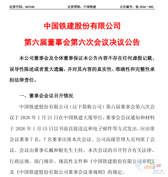 1月22日,中国铁建股份有限公司发布第六届董事会第六次会议决议公告。