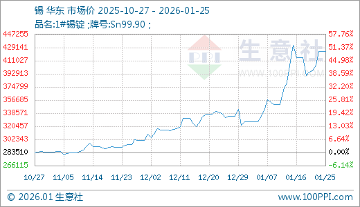 据生意社监测,锡01月25日最新价格423730.00元/吨,最近5天上涨7.08%,15天上涨20.87%,20天上涨27.32%,60天上涨43.40%。