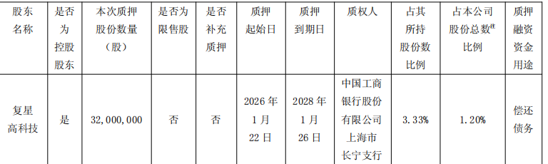 复星高科技本次将3200万股股份质押给中国工商银行股份有限公司上海市长宁支行,质押期限自2026年1月22日至2028年1月26日,融资用途为偿还债务。该笔质押股份占复星高科技所持公司股份的3.33%,占公司总股本的1.20%。