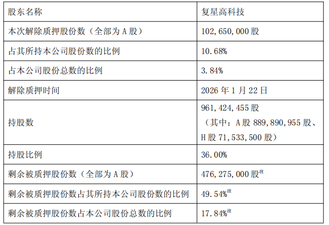 截至2026年1月22日收市,控股股东复星高科技持有公司961,424,455股股份(其中:A股889,890,955股、H股71,533,500股),约占截至当日收市公司股份总数的36.00%。本次质押及解除质押后,复星高科技质押公司股份数量余额为476,275,000股(均为A股),约占截至当日收市公司股份总数的17.84%,占其所持公司股份数的比例49.54%。