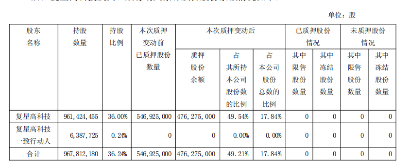 截至2026年1月22日收市,控股股东复星高科技及其一致行动人(即复星高科技董监高、复星国际有限公司及其董高 <包括公司实际控制人>,下同)合计持有公司967,812,180股股份(其中:A股890,278,680股、H股77,533,500股),约占截至当日收市公司股份总数的36.24%。本次质押及解除质押后,复星高科技及其一致行动人质押公司股份数量余额为476,275,000股(均为A股),约占复星高科技及其一致行动人所持有公司股份数的49.21%。