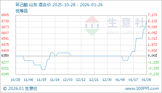 据生意社监测,环己酮01月26日最新价格6750.00元/吨,最近5天上涨3.05%,10天上涨5.47%,15天上涨7.14%。