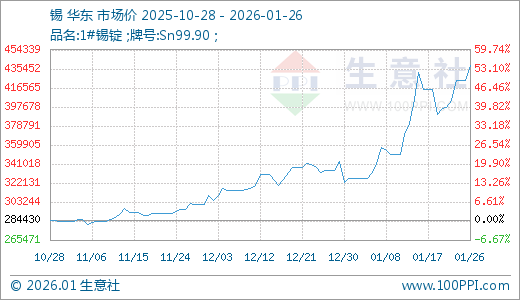 据生意社监测,锡01月26日最新价格438600.00元/吨,最近5天上涨10.36%,15天上涨25.11%,20天上涨28.42%,30天上涨31.18%,60天上涨45.17%。